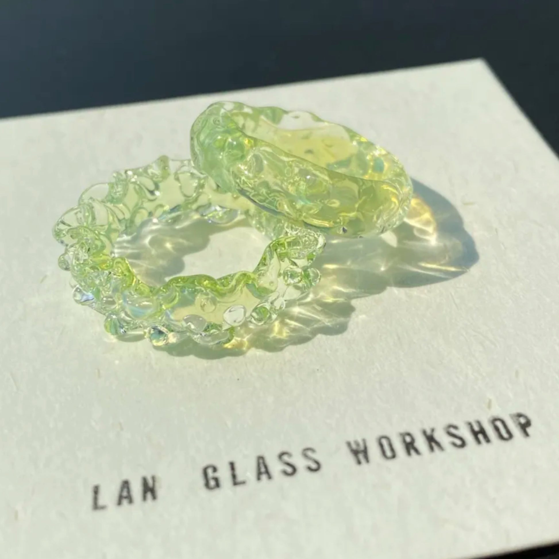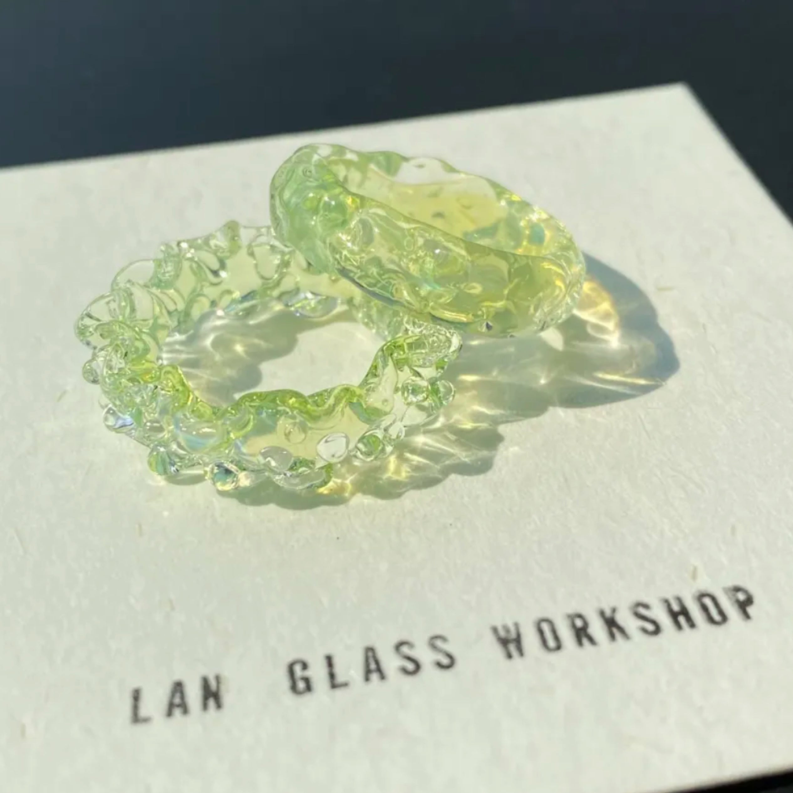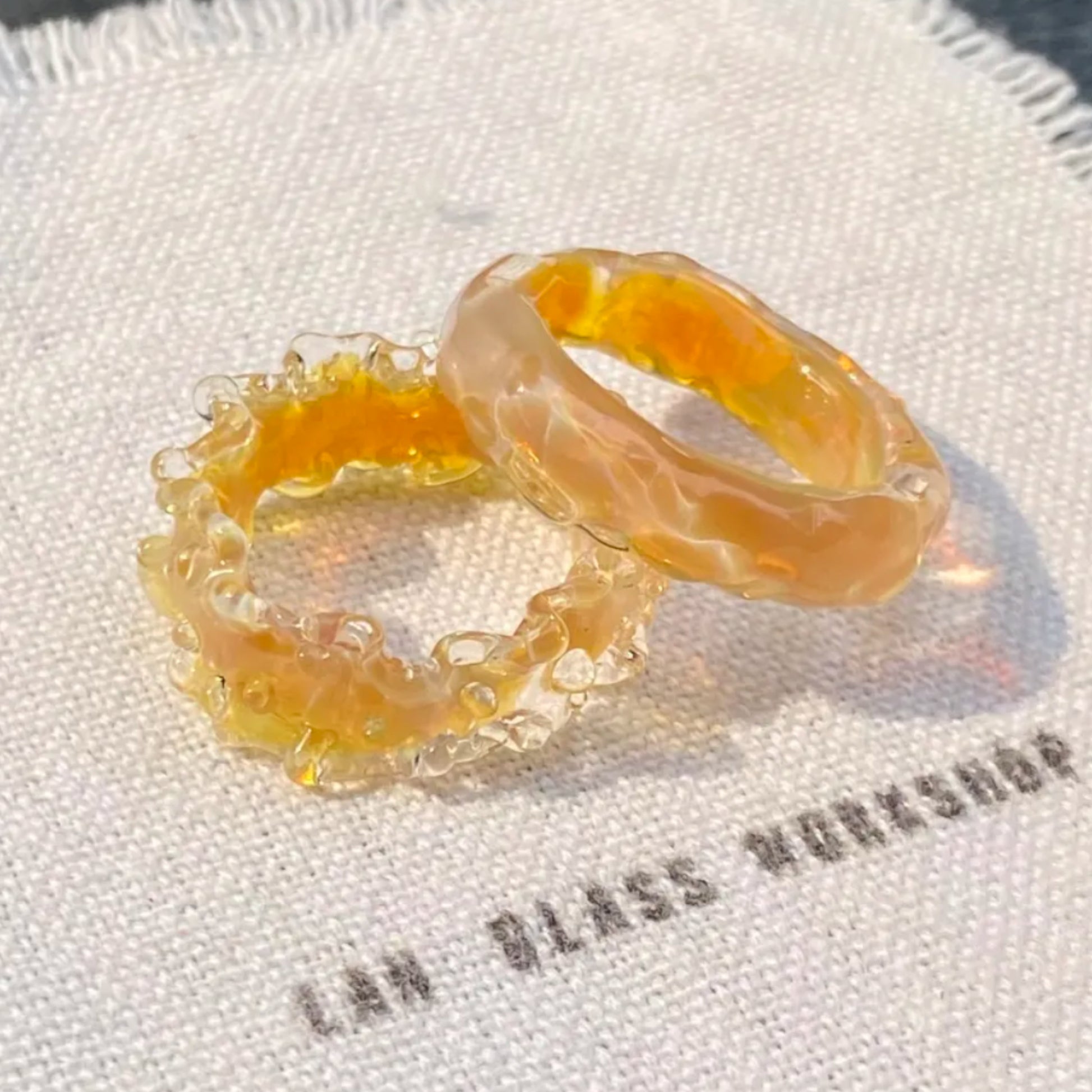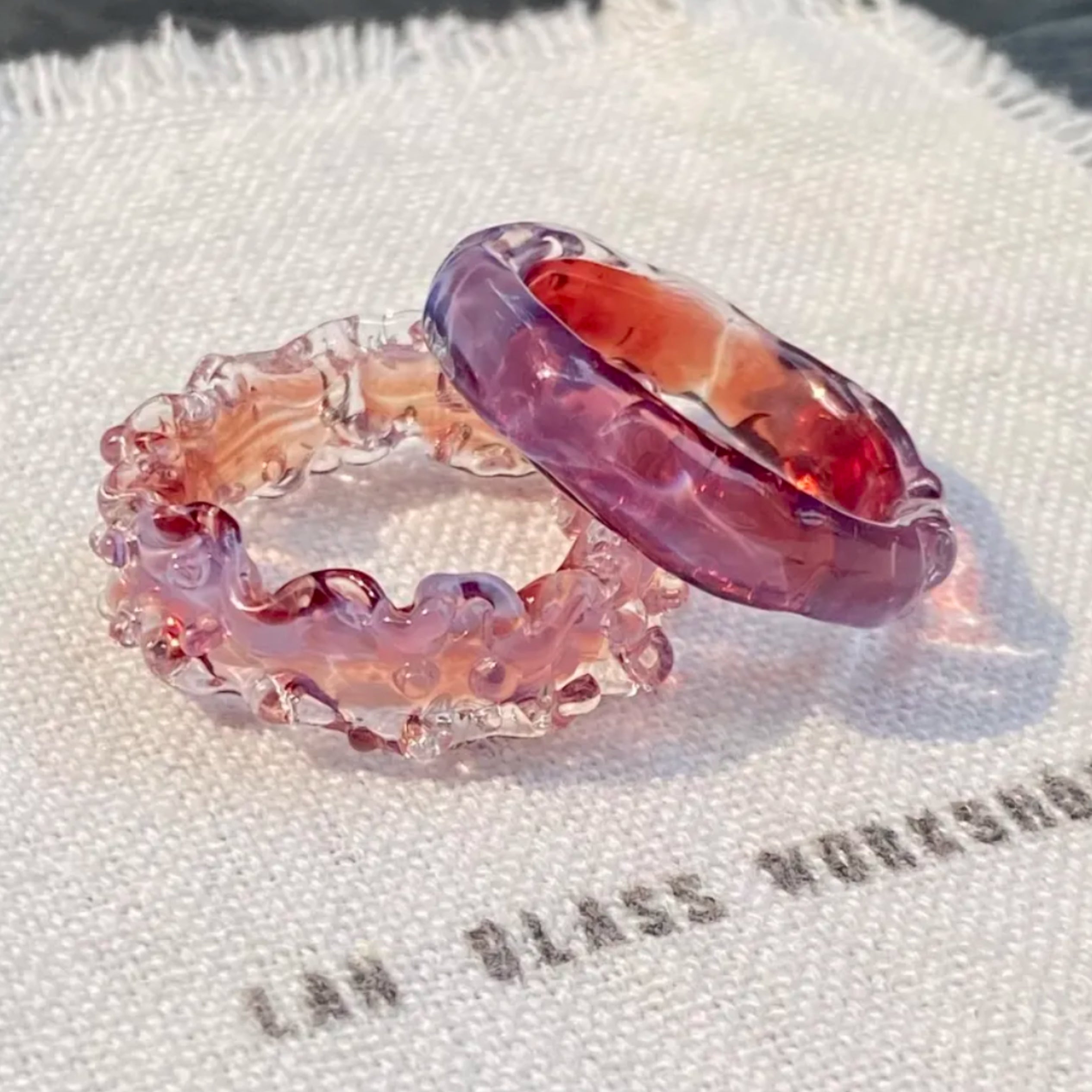 Crafted by fire, shaped by hand.Each "Artisan’s Wave" ring is individually hand-blown, making every piece as unique as your own fingerprint. Featuring a mesmerizing, rippled texture and translucent, sun-drenched colors, these glass rings are designed to be stacked, mixed, and matched. Whether you're looking for the perfect couple’s set or a vibrant statement ring, experience the soul of artisanal glass-blowing in every piece.
